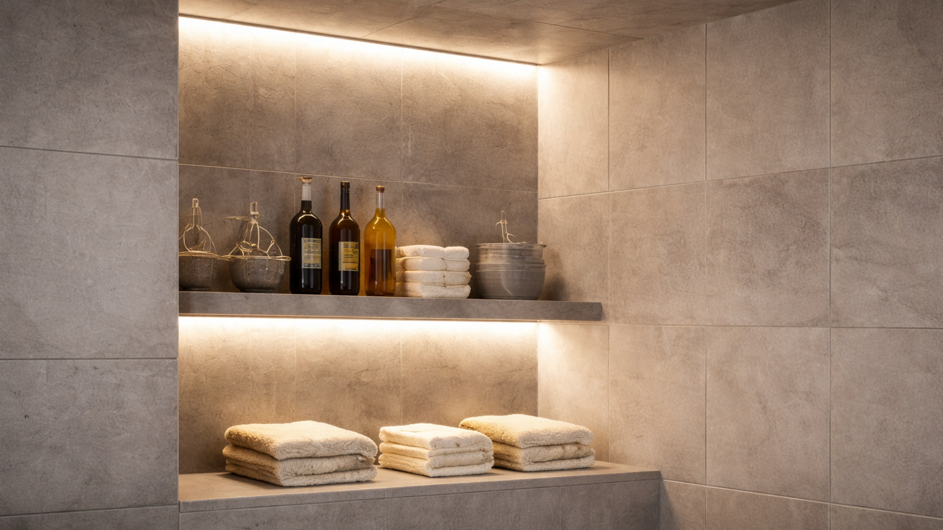 - Abschlussprofil: Für einen sauberen Randabschluss an Fliesenkanten, mit integriertem LED-Kanal zur Beleuchtung entlang der Wandkante.